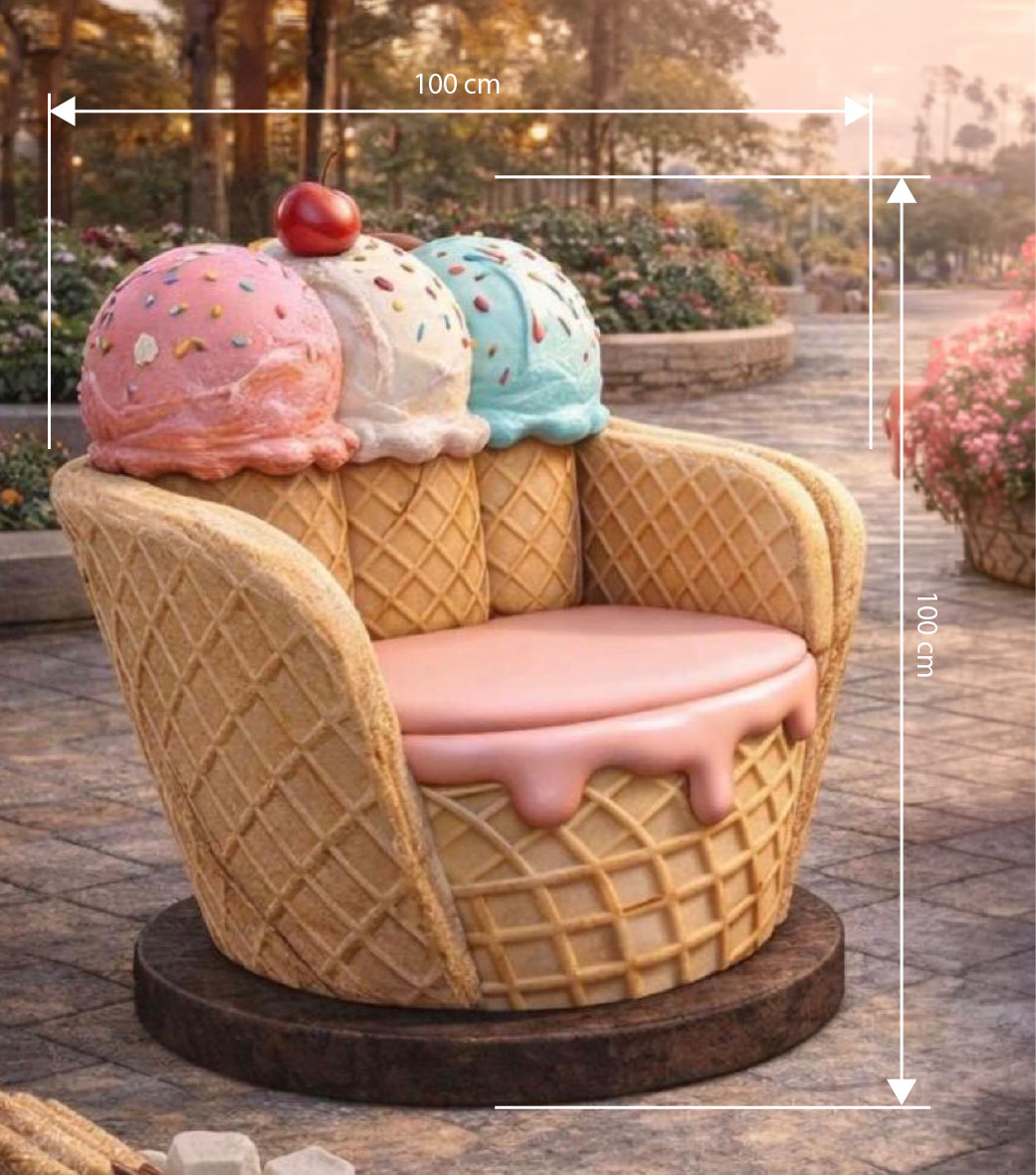 Ice Cream Scoop Armchair is a playful and eye-catching seating piece designed to resemble a large waffle cone topped with three colorful ice cream scoops and a cherry on top. The detailed waffle texture, dripping cream accents, and vibrant pastel colors create a fun and inviting atmosphere in any themed environment.