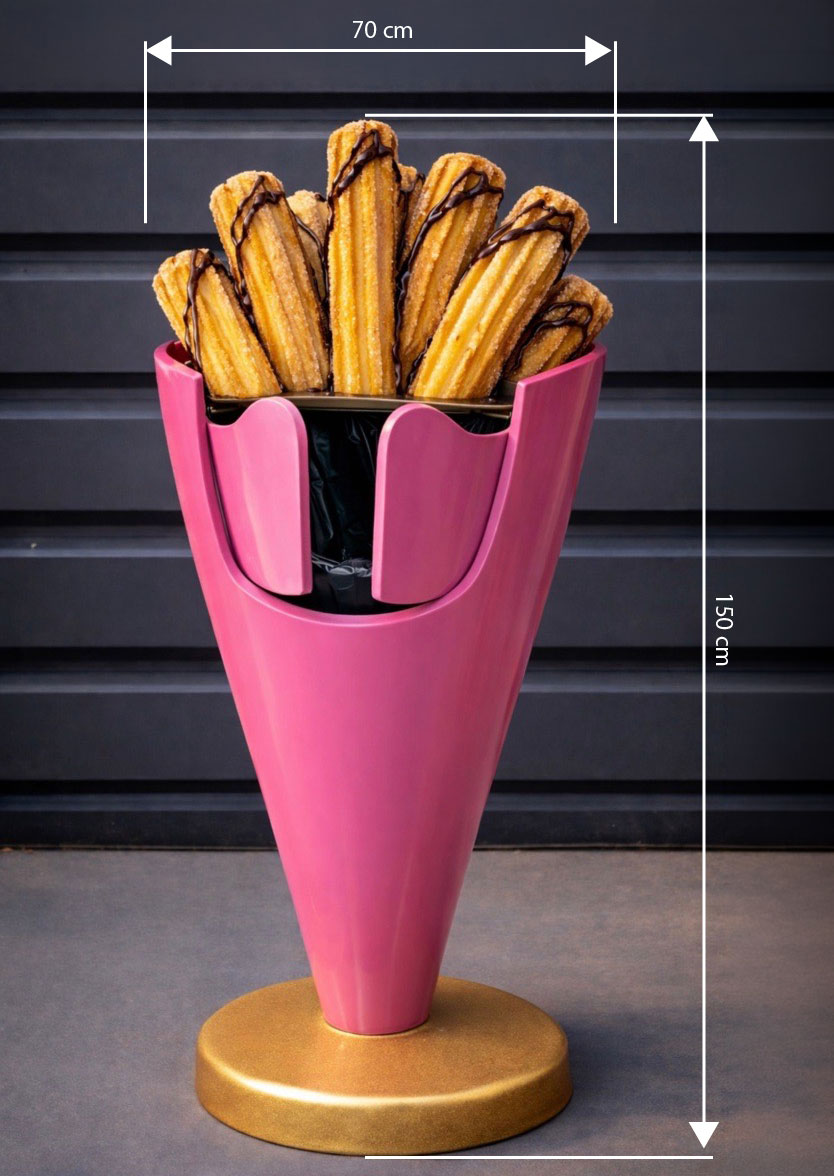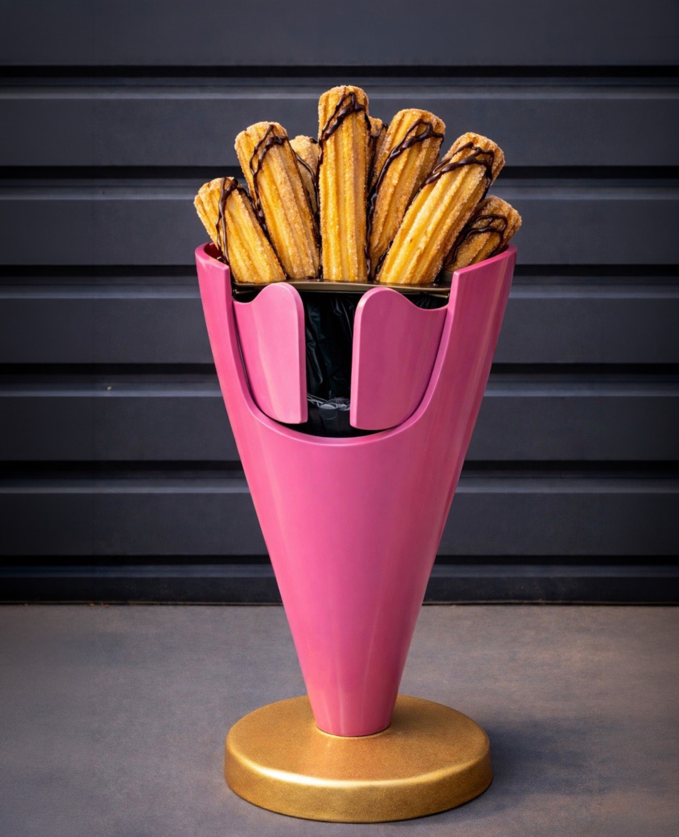 Churro Cone Trash Bin With Doors is a unique and eye-catching waste container designed in the shape of a tall dessert cone filled with churros. The top features realistic churro details with chocolate drizzle, creating a playful and appetizing visual that enhances dessert-themed spaces.