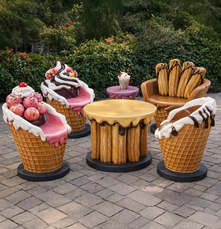 Ice Cream & Churro Dessert Furniture Set transforms any space into a vibrant, fun, and immersive environment. Inspired by sweet treats, this set combines oversized ice cream cone chairs, churro-style seating, and a matching central table designed to resemble dripping caramel or chocolate.