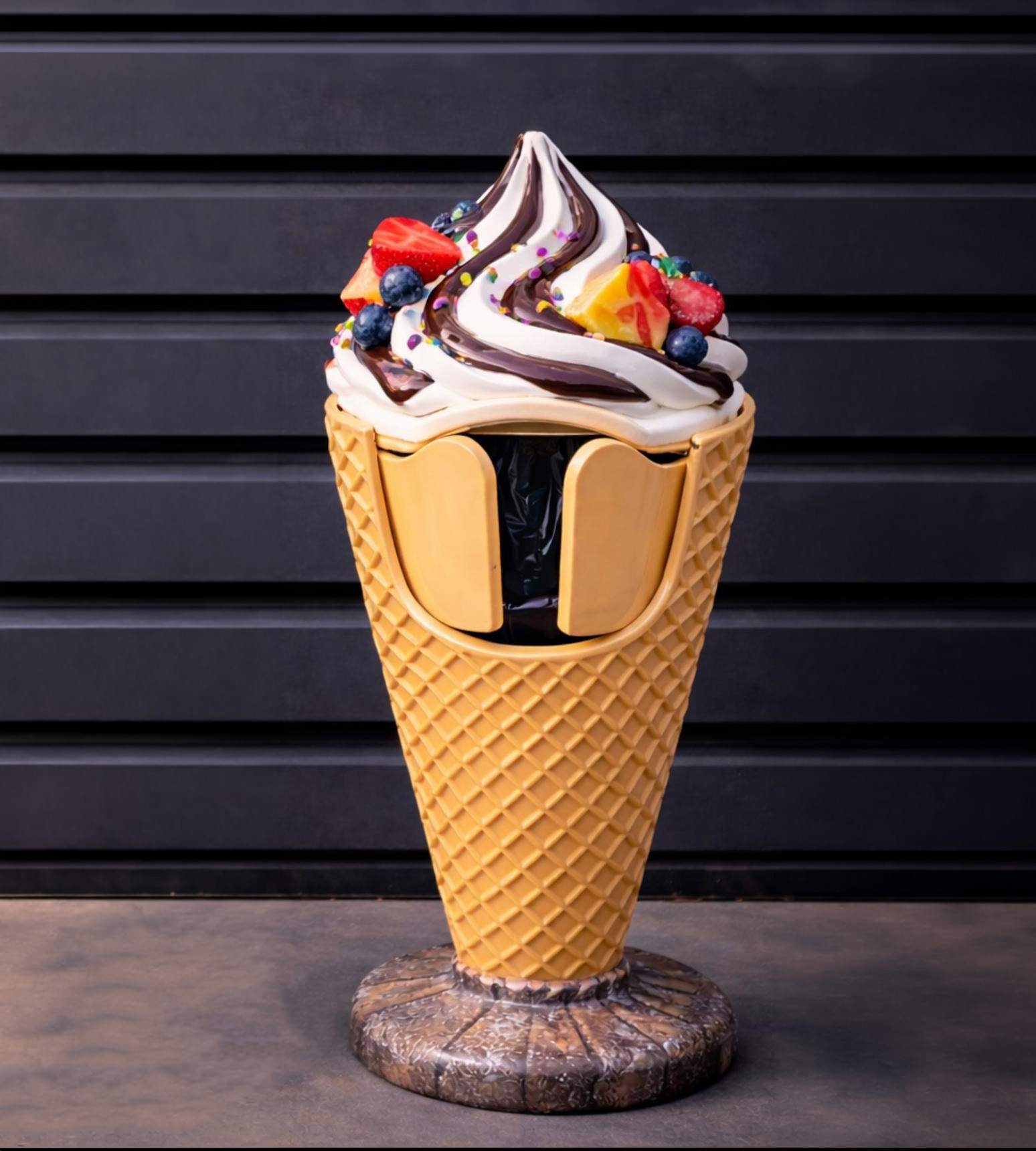 Ice Cream Cone Trash Bin is a visually striking waste container designed in the shape of a large waffle cone topped with creamy swirls, chocolate drizzle, and colorful fruit accents. The detailed textures and vibrant toppings create an eye-catching centerpiece that enhances themed environments and attracts attention.